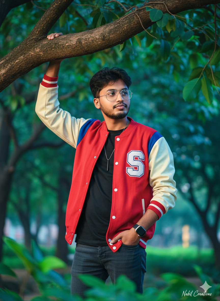 An ultra realistic high resolution cinematic portrait from reference photo. outdoors under green tree branches; one hand raised holding a thick branch, other hand in pocket. Wearing a colorful modern varsity jacket with “s”, casual T-shirt, smooth jeans, pilot spectacles, smartwatch, thin silver chain with black vertical pendant. Confident candid pose. Natural daylight with surreal deep-blue ambient fill + warm golden-hour sunlight, high contrast emotional lighting. Vibrant colors, blurred leafy foreground, shallow depth of field, cinematic portrait SIGNATURE: Nabil